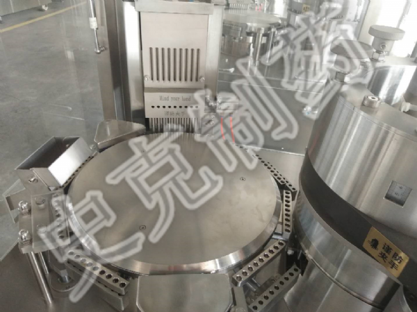 5、配備粉體物料充填機構,使粉體物料經(jīng)過膠囊填充料倉裝置連續(xù)均勻強制下料至膠囊填充區(qū);